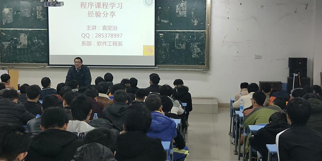 袁老师首先从学生今后的工作入手谈起如何培养学习编程的兴趣,把学习中遇到的困难看做游戏中的一个个关卡,引起学生的共鸣;然后从实际出发谈起编程学习的“四多”观点,即把多看、多练、多问、多思贯穿整个学习编程语言的全过程,并举例分析引证,获得了学生的一片片掌声;最后袁老师留下联系方式,表示愿意帮助学习进步的学生得到进一步提高。