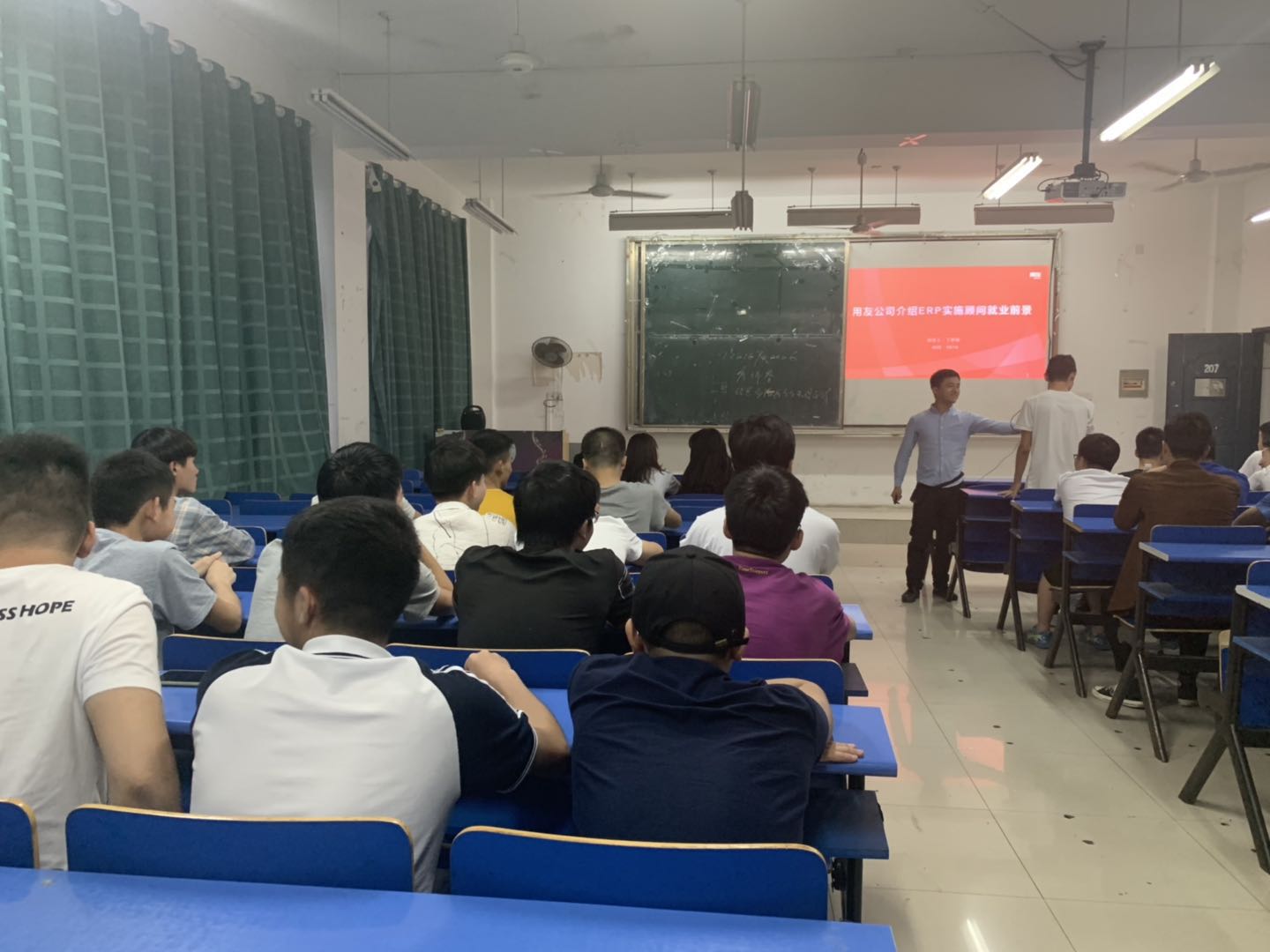 丁老师介绍了当前互联网+下的ERP行业发展现状,在市场需求的驱动下,ERP软件逐渐与互联网、手机APP上实现企业业务对接的软件结合。还从ERP行业就业岗位:软件销售、售前顾问、实施顾问、服务顾问的特点跟同学们进行分析与疏导,主要分析ERP实施顾问的能力要求、就业岗位要求、职业发展方向。丁老师谈及ERP实施顾问就业前景的环节与同学们进行了互动,同学们提出自己的问题,得到了专业的回复,对就业增添了更多的信心。