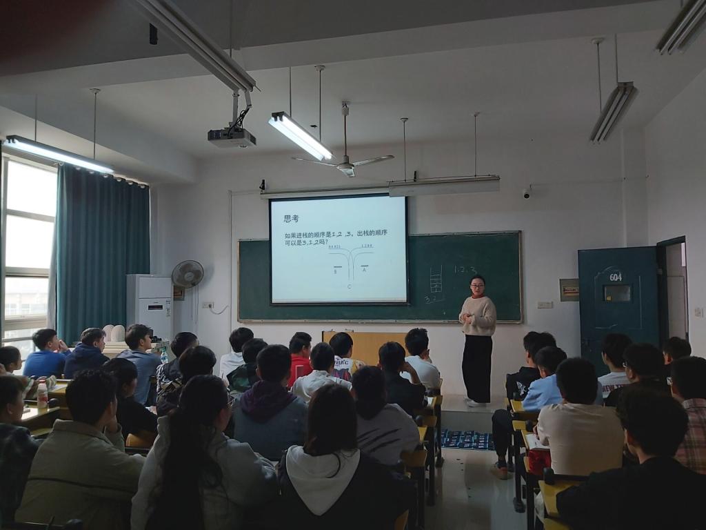 教学过程中,首先余老师结合实际中直筒装球的案例生动形象的引入课程内容栈的概念和特点,并通过与学生互动,举例列举现实生活中栈的应用案例,充分调动学生对课堂的关注度和兴趣。随后对栈结构的定义、常用操作、入栈、栈等概念举行了重点阐述与代码实现。整个过程中突出“教”与“学”的主体性与交互性,以学生为中心,密切贴近生活和日常应用,并注重讲练结合,让学生在轻松而又熟悉的氛围里掌握知识的特点与实现应用,取得了较好的效果。