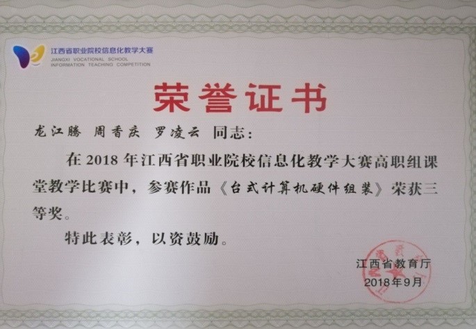 四、大力推进信息化和翻转课堂教学改革,通过引进超星集团学银在线网络学习平台和泛雅网络学习平台,已建设完成《WEB前端设计》、《Android系统开发》等26门线上课程。参加江西省高校教师第二、三届移动教学大赛获奖,计算机组装与维护课程代表学院参加江西省职业院校信息化教学大赛获得三等奖。