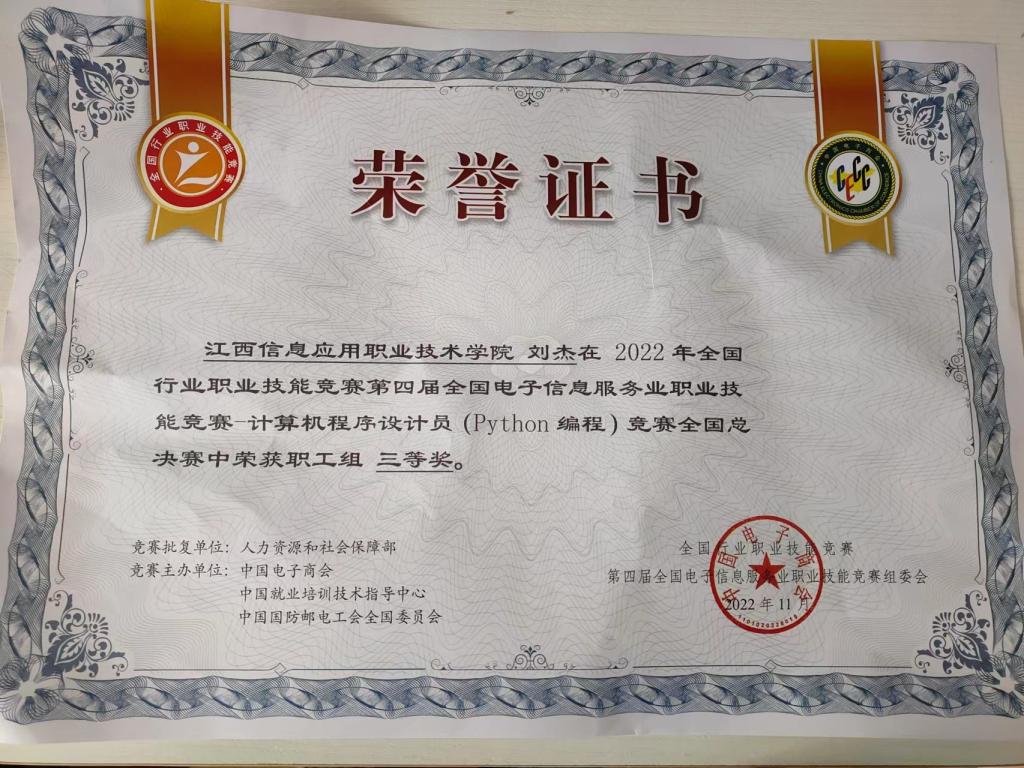 日前,2022年全国行业职业技能竞赛第四届全国电子信息服务业职业技能竞赛计算机程序设计员(Python编程)竞赛全国总决赛在深圳圆满落下帷幕。从竞赛组委会传来喜讯,贝博官网ballBET贝博BB艾弗森刘杰老师参加的计算机程序设计员(Python编程)职工组赛项荣获全国三等奖、江西省第二名的好成绩。