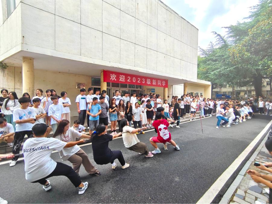 凝心聚力,拔河比赛。9月12日下午,大礼堂门口高呼声不断,场上队友们紧握长绳,场下啦啦队加油助阵,欢呼呐喊声不断,现场激烈的竞赛气氛一浪胜过一浪。本次拔河比赛展现了新生们积极向上、团结一致、奋勇争先的精神风貌。
