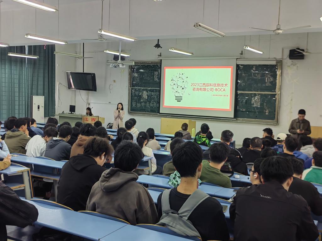 2023年11月8日,江西辰科信息技术咨询有限公司在博学楼J201阶梯教室进行专场招聘,ballBET贝博BB艾弗森2021级中外方向100多名学生参加宣讲会。