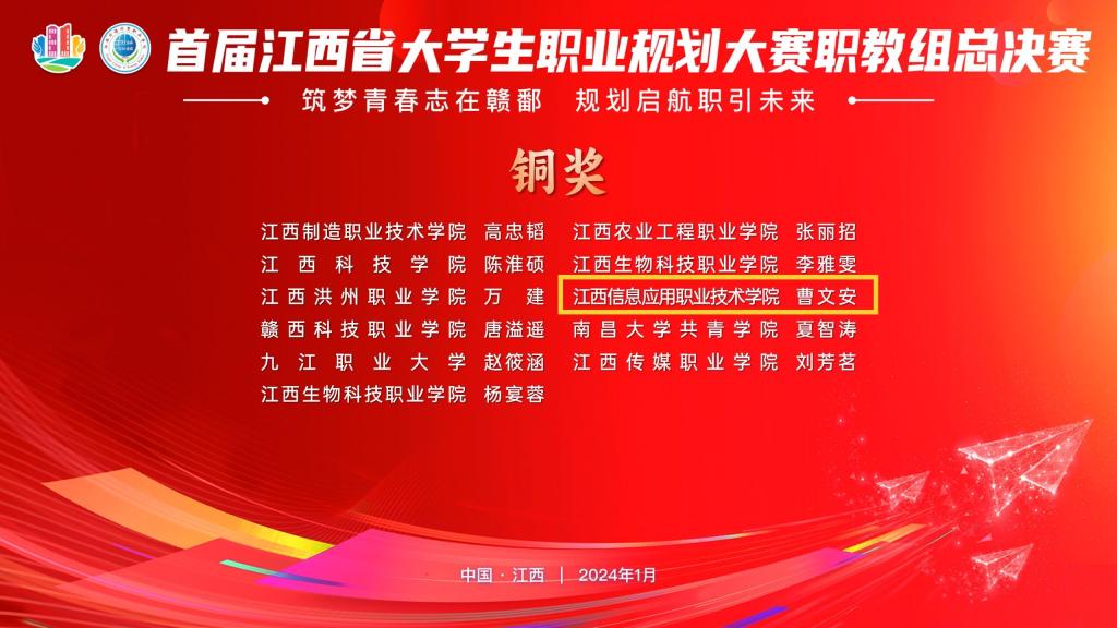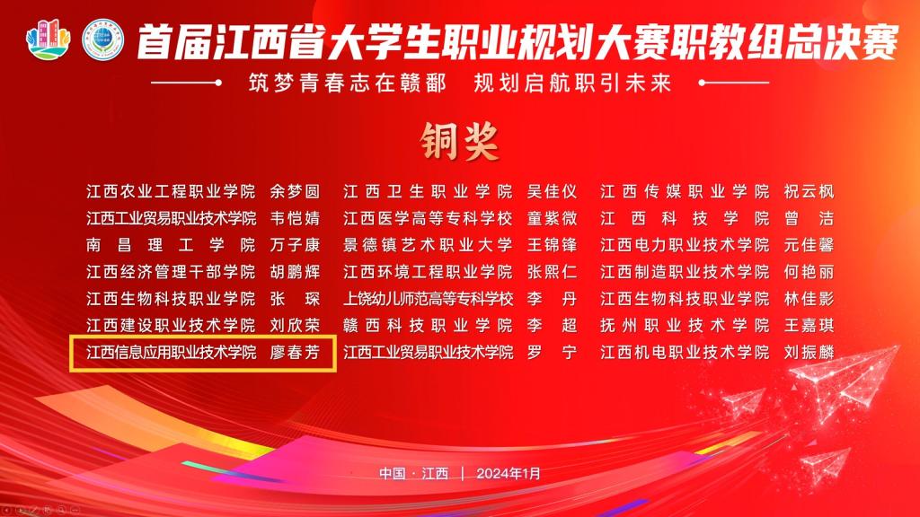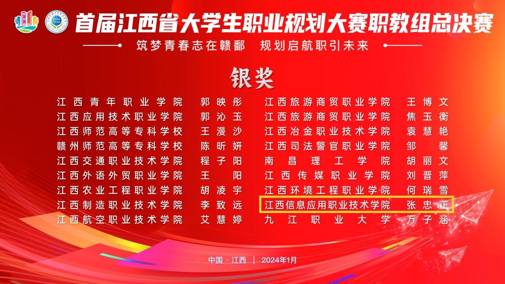 1月20日,我校三位学生参加了首届江西省大学生职业规划大赛职教组总决赛,并取得佳绩。测绘工程系张忠正获得成长赛道银奖(指导老师:于冬雪、夏阳、黄欢),数字技术学院廖春芳获得成长赛道铜奖(指导教师:李忠新、李升、程栋梁),计算机技术系曹文安获得就业赛道铜奖(指导教师:赖舒妮、吴琛、李雨涵)。