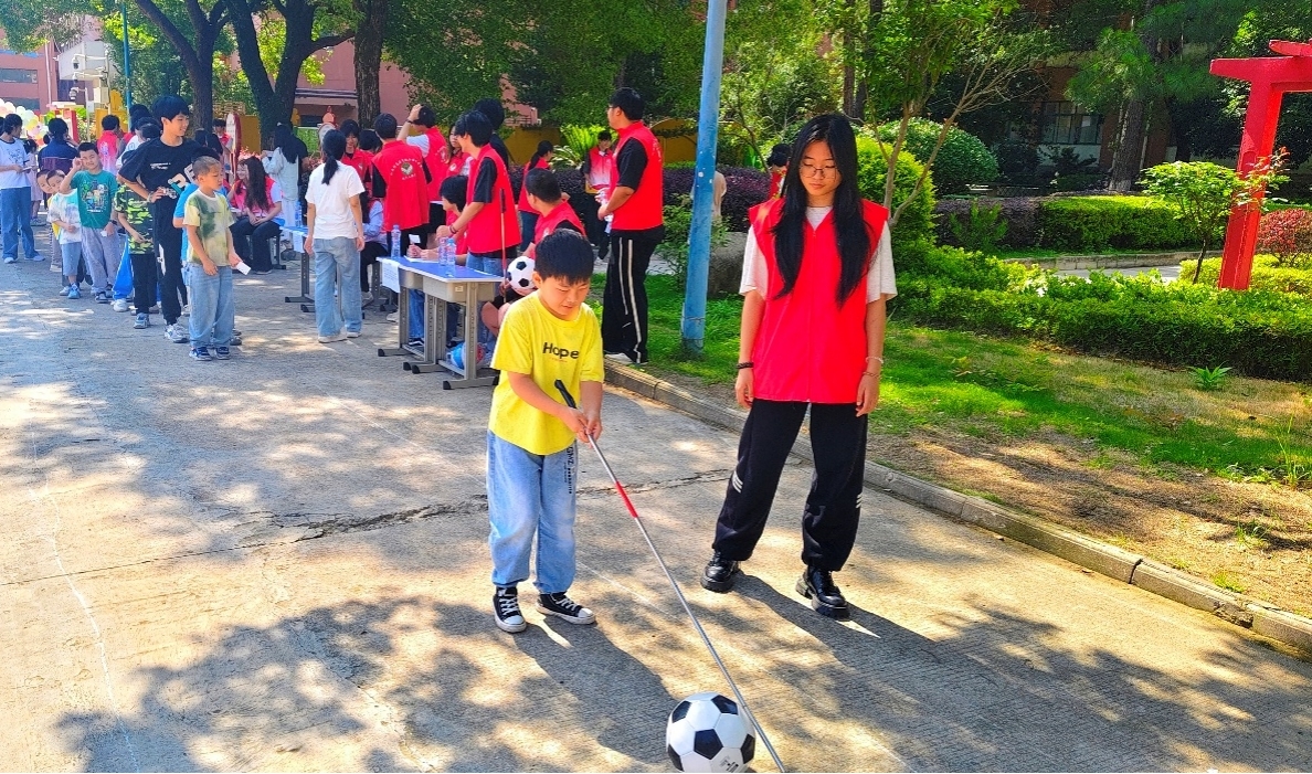 在南昌启音学校的校园里,身着红色志愿服的青年们与儿童的互动画面格外温馨。此次活动精心设计了 “你来比划我来跳”“纸杯传球”“快乐传递”“123 木头人”“赶猪猪” 五个趣味游戏,通过无语言障碍的互动形式,让孩子们在肢体协作与视觉感知中感受节日氛围。活动现场,由志愿者们手绘的彩色游戏指引牌竖立在各个区域,志愿者们提前学习的基础手语图示贴满了休息区,细节处的用心为无声交流搭建起温暖桥梁。这些游戏通过色彩识别、肢体协调、团队配合等设计,让孩子们在沉浸式体验中感受互动乐趣,既锻炼了感知能力,又在协作中收获了快乐。
